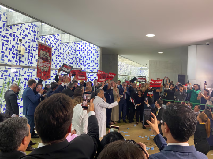 Deputados da oposição realizaram um ato nesta terça-feira (24), no Salão Verde da Câmara, para manifestar repúdio à homenagem prestada pela escola de samba Acadêmicos de Niterói ao presidente Luiz Inácio Lula da Silva durante o Carnaval do Rio de Janeiro.